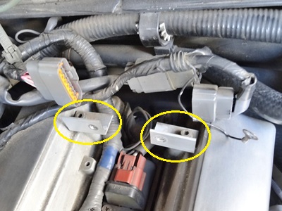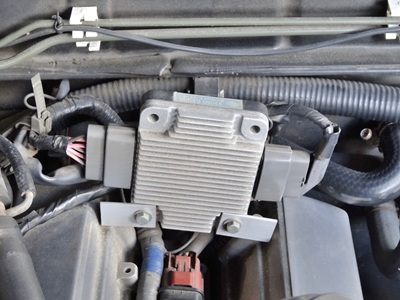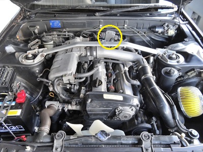 エアフロメーターを洗浄すると、①と②の「エンスト」と「減速」は起こってないので、改善されたと思いますが、③の「ハンチング」は、依然症状が発生している状況です。そこで今回は、現在のパワートランジスター(中古を約15年使用品)が、経年劣化による電圧不安定で妖しそうなので、これをほぼ新品のものに交換して、エンジンの不調が直るかを確認したいと思います。それでは、丸印のパワートランジスターを取り外しましょう。