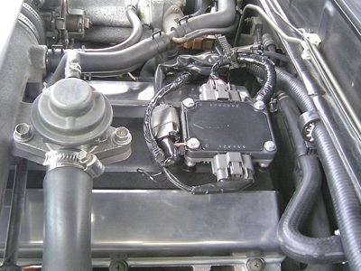 ちなみに、こちらが本来の横置きの写真です。パワトラは、プラグカバーの上にボルト固定(4箇所)されています。そしてプラグカバーの下には、ダイレクトイグニッションコイルやハーネスがあり、これらは密閉状態のため、エンジンの熱がこもりやすくなっています。