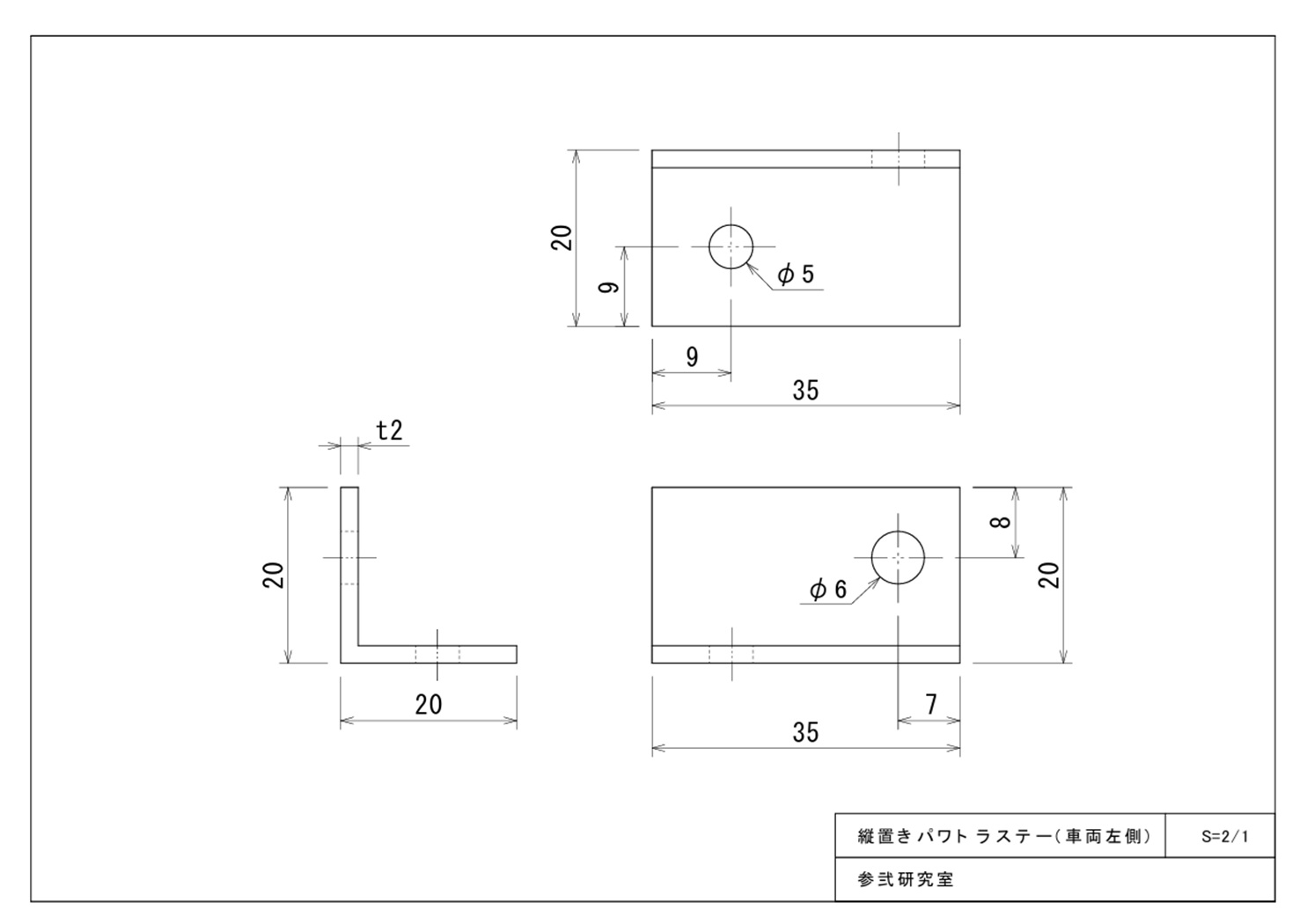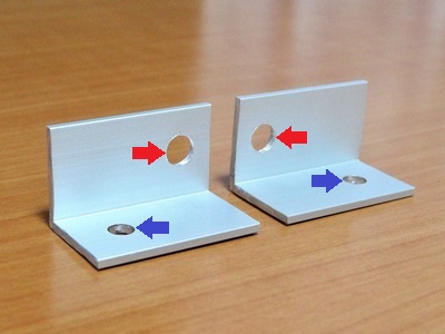 縦置きパワトラステーは、アルミのアングル(縦20mm×横20mm×厚さ2mm)を長さ35mmで切断し、穴をあけて作製しました。写真の左側が車両左側用、右側が車両右側用です。赤色矢印がパワトラの取付穴で直径約6mm、青色矢印がロッカーカバーの取付穴で直径約5mmになります。