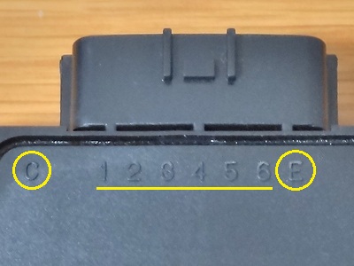上側のコネクタハウジング(7極)の拡大写真です。左側丸印の「C」は、NPN型トランジスターのコレクタ(Collector)を表す記号で、ハウジング内には、増幅された電流を取り出す端子(6極)があり、下線「1~6」はエンジンシリンダー番号[№1~№6]と対応しています。また、右側丸印の「E」はエミッタ(Emitter)を表し、アース端子(1極)があります。