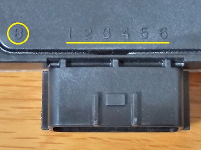 こちらは、下側のコネクタハウジング(6極)になります。左側丸印の「B」はベース(base)を表す記号で、ハウジング内には、電流を入力する端子(6極)があり、下線「1~6」はエンジンシリンダー番号[№1~№6]と対応しています。