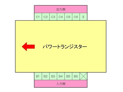 図で描くと、こんな感じ。赤色矢印は車両前方を示しています。上側のコネクタハウジングは、電流の出力側で「C1~C6」と「E」の7極あり、下側のコネクタハウジングは、電流の入力側で「B1~B6」の6極あります。