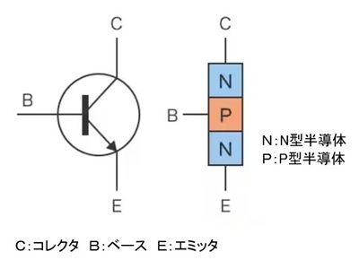 ちなみに、左側がNPN型トランジスターの回路記号(コレクタ、ベース、エミッタ)で、右側がNPN型トランジスターの接合状態(N型半導体、P型半導体)になります。