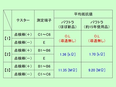 2つのパワトラ(ほぼ新品、中古を約15年使用品)について、テスターで抵抗値を測定した結果を表にしました。尚、表中の抵抗値はエンジンシリンダー番号[№1~№6]の各抵抗値を平均した値です。【1】はコレクタ・エミッタ間の抵抗値Rceです。NPN型トランジスターでは、ベースに電流が流れない場合、コレクタ・エミッタ間はスイッチが開いた状態となり、抵抗値が無限大を示します。本測定値は、O.L(OVER LIMIT)を示し、抵抗値が無限大であるので正常だと分かりました。他方、ベースに電流が流れる場合、コレクタ・エミッタ間はスイッチが閉じた状態となり、抵抗値が0[Ω]となります。【2】はベース・エミッタ間の抵抗値Rbeです。ベース・エミッタ間は半導体であるため、抵抗値は1~10[kΩ]が目安とされています。本測定値は、1~2[kΩ]を示し、抵抗値が正常だと分かりました。【3】はベース・コレクタ間の抵抗値Rbcです。ベース・コレクタ間も半導体となりますが、抵抗値は数百[kΩ]~数[MΩ]以上の非常に高い抵抗値となるようです。本測定値は、9~12[MΩ]を示し、抵抗値が正常だと分かりました。以上から、2つのパワトラの抵抗値については、多少の差はあるが問題ないレベルだと思われます。